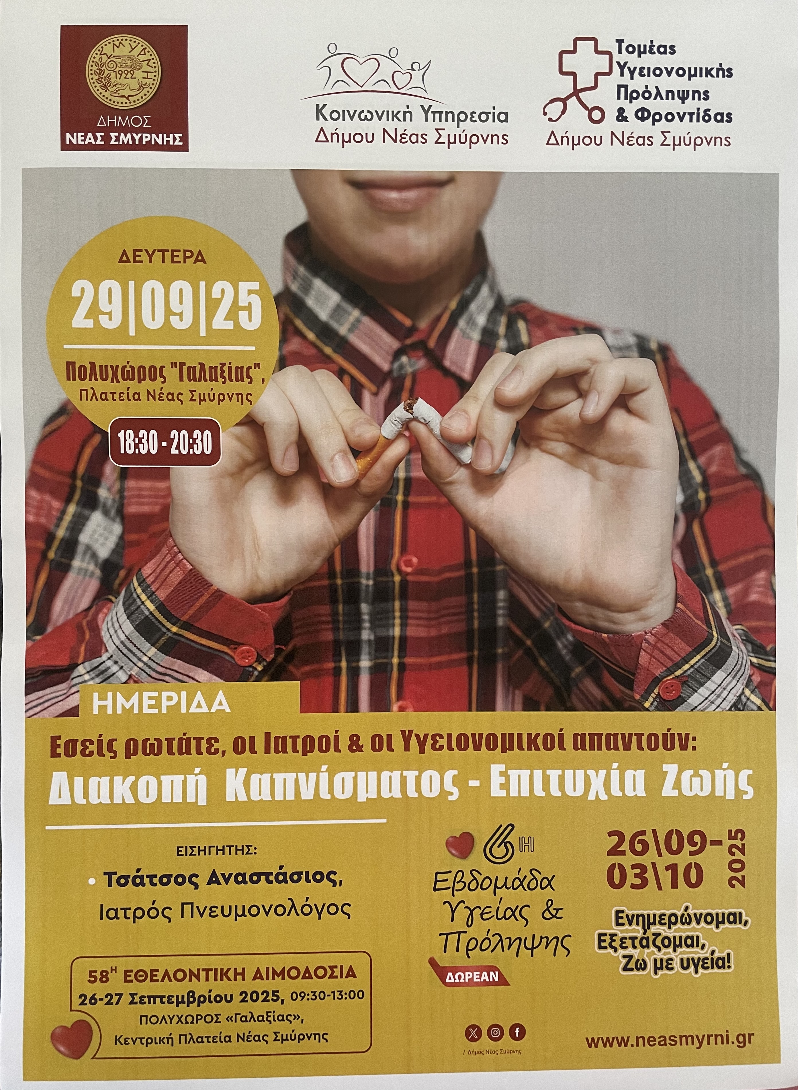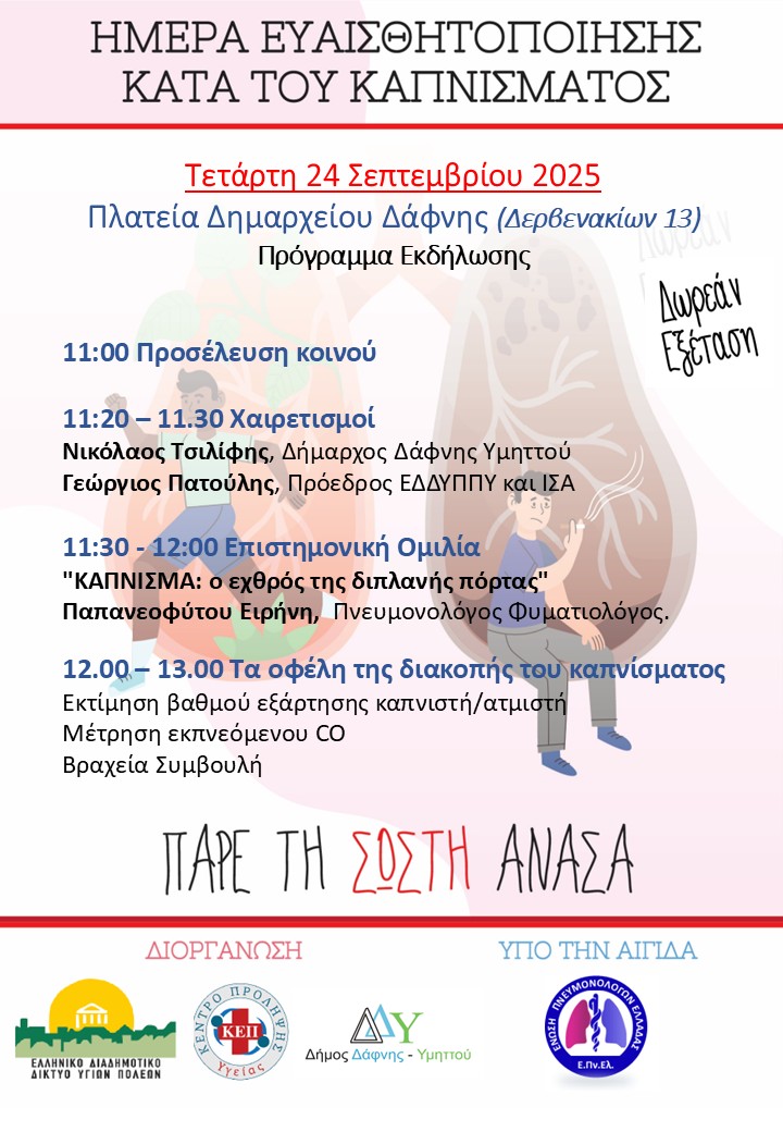Η δράση συμπεριλαμβάνει ενημερωτικές ομιλίες καθώς και δωρεάν εξετάσεις από την ομάδα του Ιατρείου Διακοπής Καπνίσματος του Δήμου Περιστερίου.