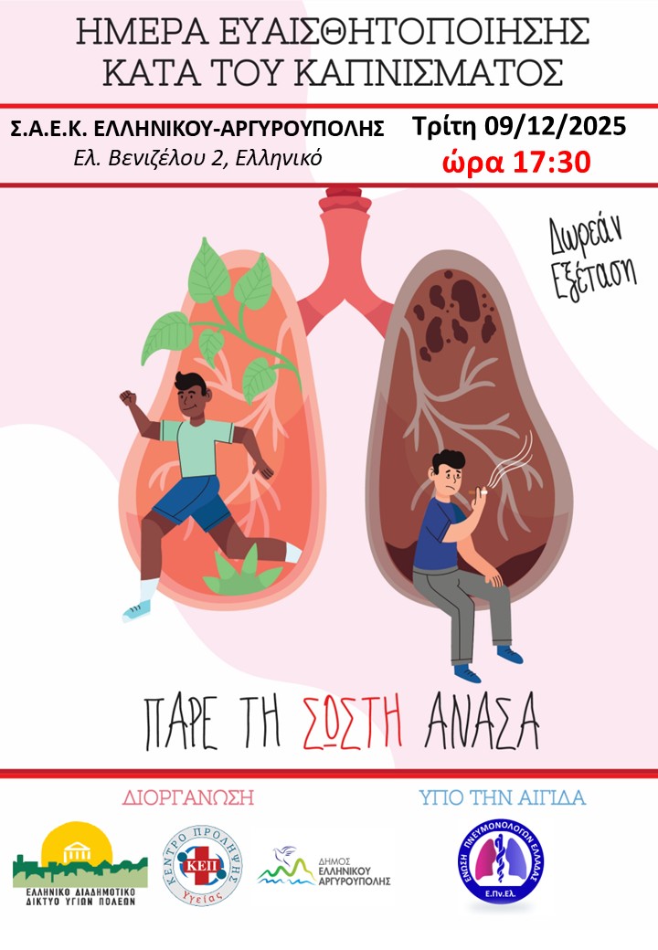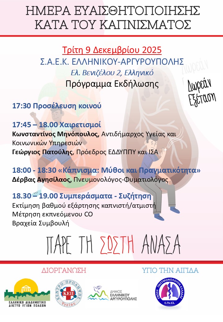 Το Ελληνικό Διαδημοτικό Δίκτυο Υγιών Πόλεων , το Κέντρο Πρόληψης Υγείας, και ο Δήμος Ελληνικού – Αργυρούπολης , υπό την Αιγίδα της Ένωσης Πνευμονολόγων Ελλάδας, διοργανώνουν εκδήλωση με δωρεάν εξέταση καπνιστών-ατμιστών ,ομιλίες, και συζήτηση με πρώην καπνιστές- ατμιστές.